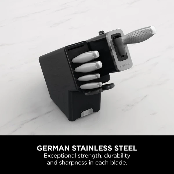 ست چاقو 6 تکه: مجموعه چاقوی آشپزخانه با کیفیت بالا ساخته شده از فولاد ضد زنگ شامل یک چاقوی سرآشپز، چاقوی نان، چاقوی ژامبون، چاقوی کاربردی، چاقوی جداکننده و قیچی، بهعلاوه یک بلوک چاقوی سفید مدرنفولاد ضد زنگ: ساخته شده از فولاد ضد زنگ آلمانی جعلی چاقوهای نینجا دارای ساختار پرچ دوتایی بادوام هستند مقاوم در برابر زنگ زدگی و به اندازه کافی قوی برای تمام کارهای برش در آشپزخانه شما.طراحی فول تانگ: ساخته شده از یک تکه فلز برای ارائه یک برای ایجاد یک چاقوی قوی تر و بادوام تر که کاملاً جا می شود در دست شما احساس تعادل می کندتیغه های تیز: با چاقو تیزکن StaySharp یکپارچه که در بلوک چاقو تعبیه شده است، چاقوهای شما با آن می مانند فوق العاده تیز در خانه نگهداری کنید.شامل: ست 6 تکه: چاقوی آشپز 20 سانتی متری، چاقوی نان 20 سانتی متری، 20 سانتی متری چاقوی ژامبون ژامبون، چاقوی جهانی 13 سانتیمتری، چاقوی خردکن 9 سانتیمتری، قیچی، بلوک چاقو با تیز کن یکپارچه. وزن: 2.5 کیلوگرم. ابعاد: L: 361mm x W: 173mm x H: 327mm.